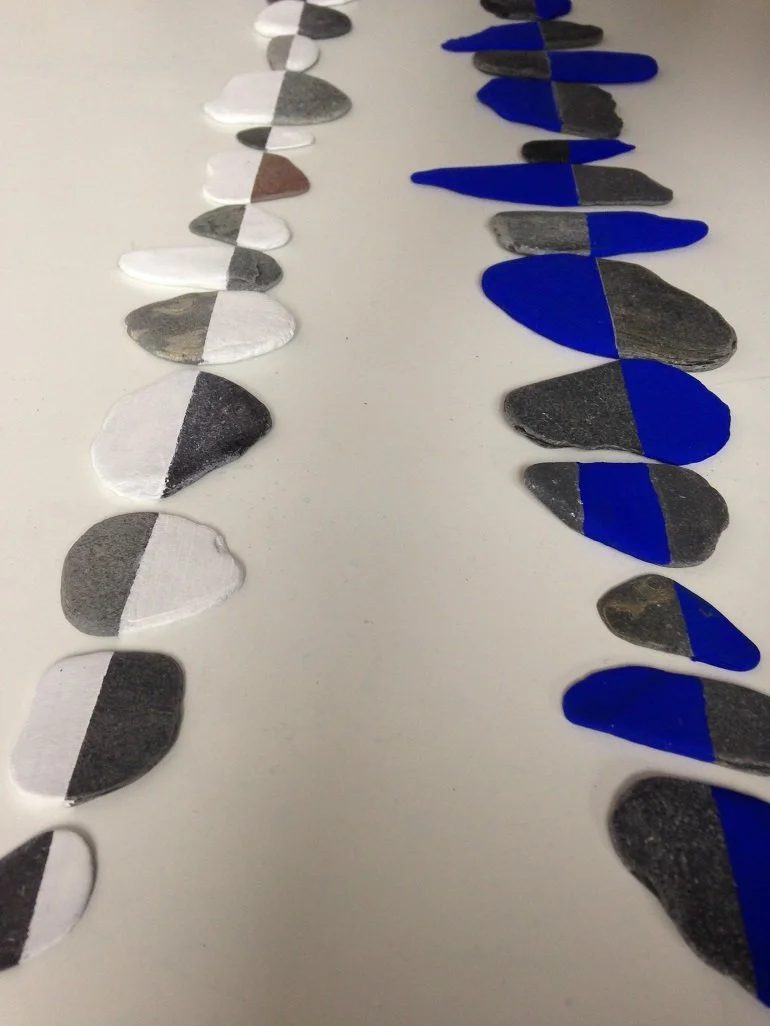 I collect flat stones, smoothed and sea washed, sheeny and wonderful in my hand. Then order and paint them in the colours of the sea.